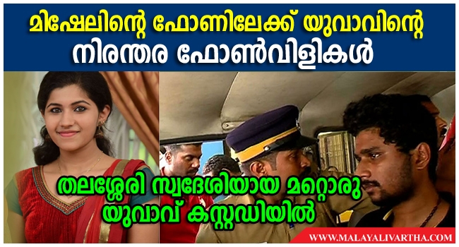 കായലില് മരിച്ച നിലയില് കാണപ്പെട്ട മിഷേല് ഷാജിയെന്ന സിഎ വിദ്യാര്ത്ഥിയുടെ മരണത്തിലെ ദുരൂഹത ഇനിയും നീക്കാന് പോലീസിന് സാധിച്ചിട്ടില്ല. മിഷേലുമായി ബന്ധമുണ്ടെന്ന് പോലീസ് പറയുന്ന ക്രോണിന് എന്നയാള് നിലവില് പോലീസ് കസ്റ്റഡിയിലുണ്ട്. അത് കൂടാതെ തലശ്ശേരി സ്വദേശിയായ മറ്റൊരു യുവാവിനേയും പോലീസ് കസ്റ്റഡിയിലെടുത്തിട്ടുണ്ട്. മിഷേല് ഷാജിയുടെ ഫോണിലേക്ക് തലശ്ശേരി സ്വദേശിയായ യുവാവിന്റെ ഫോണില് നിന്നും ഇടയ്ക്കിടെ കോളുകള് വന്നതായി പോലീസ് കണ്ടെത്തിയിട്ടുണ്ട്. ഇതിന്റെ അടിസ്ഥാനത്തിലാണ് ഇയാളെ കസ്റ്റഡിയിലെടുത്തിരിക്കുന്നത്.