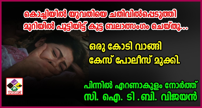 നഗരമധ്യത്തില് യുവതിയെ ഒരുമാസത്തോളം മുറിയില് പൂട്ടിയിട്ടു ബലാല്സംഗം ചെയ്തു. ഇരുപത്തഞ്ചോളം പേര് പ്രതികളായ സംഭവം പോലീസും അഭിഭാഷകനും ഉള്പ്പെട്ട സംഘം ഒരുകോടിയോളം രൂപ വാങ്ങി ഒതുക്കി. സംഭവത്തില് എറണാകുളം നോര്ത്ത് സി.ഐ ടി.ബി. വിജയനെതിരേ കര്ശനനടപടിയാവശ്യപ്പെട്ടു സംസ്ഥാന രഹസ്യാന്വേഷണ വിഭാഗം (എസ്.എസ്.ബി) ആഭ്യന്തരവകുപ്പിനു റിപ്പോര്ട്ട് നല്കി. സി.ഐക്കെതിരേ കര്ശന നടപടിക്കു ശിപാര്ശ ചെയ്ത് കൊച്ചി സിറ്റി പോലീസ് കമ്മിഷണറും സര്ക്കാരിന് റിപ്പോര്ട്ട് നല്കി.
