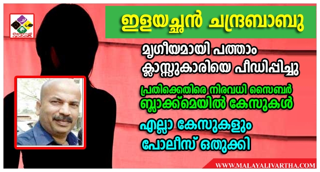 ശാന്തിഗിരി കാഞ്ഞാംപാറ ജനപ്രിയ വീട്ടില് താമസിക്കുന്ന ആലപ്പുഴ ചേര്ത്തല സ്വദേശി ചന്ദ്രബാബു (42)ആണ് എറണാകുളത്ത് അറസ്റ്റിലായത്. പോത്തന്കോട് പുലന്തറയിലെ പ്രമുഖ സ്കൂളിലെ വിദ്യാര്ത്ഥിനിയാണ് പീഡനത്തിനിരയായത്. സംഭവത്തില് ആഴ്ചകള്ക്കു മുമ്പ് പോലീസ് പിടികൂടി വിട്ടയച്ച ഇയാളെ സ്കൂള് അധികൃതരുടെയും നാട്ടുകാരുടെയും ശക്തമായ ഇടപെടലിനെ തുടര്ന്നാണ് അറസ്റ്റു ചെയ്തത്. കഴിഞ്ഞ ഫെബ്രുവരി മൂന്നിനാണു സംഭവം. പഠനത്തില് പിന്നോക്കം നില്ക്കുന്ന കുട്ടികളെ സ്കൂള് പ്രിന്സിപ്പല് പ്രത്യേക കൂടികാഴ്ചയ്ക്കു വിളിച്ചപ്പോഴാണ് പീഡനവിവരമറിഞ്ഞത്.