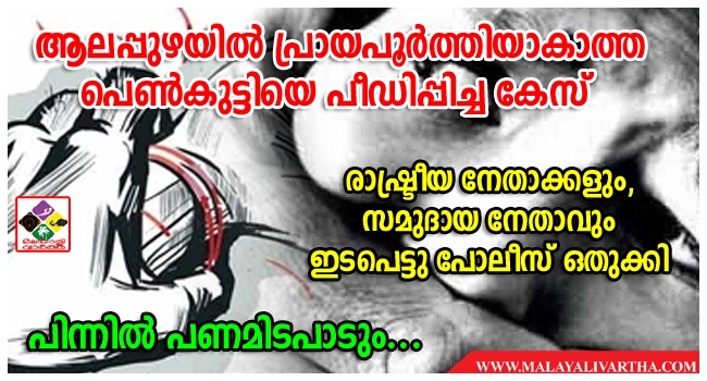 ആലപ്പുഴ ജില്ലയിലെ തൃക്കുന്നപ്പുഴ പോലീസ് സ്റ്റേഷന് പരിധിയിലായിരുന്നു സംഭവം. വീട്ടില് മറ്റാരുമില്ലാത്ത സമയത്ത് എത്തിയ അയല്വാസിയായ യുവാവ് കത്തികഴുത്തില്വച്ചു ഭയപ്പെടുത്തിയശേഷം പീഡിപ്പിച്ചെന്നാണു പതിനാറുകാരിയുടെ പരാതി. 2016 മേയ് രണ്ടിനായിരുന്നു സംഭവം. തുടര്ന്ന് കൈ ഞരമ്പു മുറിച്ച് ആത്മഹത്യയ്ക്കു ശ്രമിച്ച പെണ്കുട്ടിയെ അടുത്തുള്ള സര്ക്കാര് ആശുപത്രിയില് പ്രവേശിപ്പിച്ചു. ഇതോടെ സംഭവം മൂടിവയ്ക്കാന് പലരും സമ്മര്ദവുമായി കുട്ടിയുടെ കുടുംബാംഗങ്ങളെ സമീപിച്ചു.