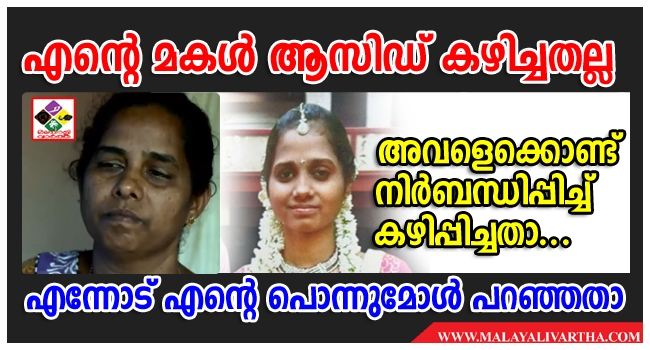 വാണിയംകളം പി.കെ ദാസ് മെഡിക്കല് കോളജില് ആസിഡ് ഉള്ളില് ചെന്ന് മരിച്ച സൗമ്യയുടെ മരണം ആത്മഹത്യയല്ലെന്ന് അമ്മ. താന് സ്വയം ആസിഡ് കഴിച്ചതല്ലെന്നും മറ്റാരോ തന്നെ നിര്ബന്ധിപ്പിച്ച് കഴിപ്പിച്ചതാണെന്നും ചികില്സയിലിരിക്കെ മകള് തന്നോട് പറഞ്ഞുവെന്ന് അമ്മ പാറുക്കുട്ടി വ്യക്തമാക്കി. ഐ.സി.യുവില് കഴിഞ്ഞ സൗമ്യയെ പി.കെ ദാസ് മെഡിക്കല് കോളജ് അധികൃതര് നിര്ബന്ധിച്ച് ഡിസ്ചാര്ജ് ചെയ്യിക്കുകയായിരുന്നുവെന്നും അമ്മ ആരോപിച്ചു. വീട്ടിലെത്തി രണ്ടാം ദിവസം സൗമ്യ രക്തം ഛര്ദിച്ചു. വീണ്ടും പി കെ ദാസ് മെഡിക്കല് കോളജിലെത്തിച്ചപ്പോള് ഇവിടെ അഡ്മിറ്റ് ചെയ്യാനാവില്ലെന്ന് പറഞ്ഞതായും അവര് വ്യക്തമാക്കി.