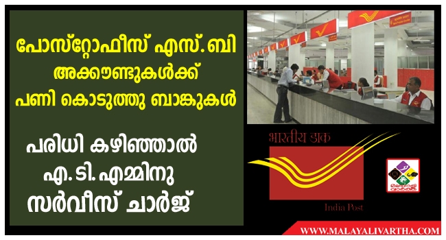മെട്രോ നഗരങ്ങളില് മൂന്ന് തവണയില് കൂടുതലും മറ്റ് നഗരങ്ങളില് അഞ്ച് തവണയില് കൂടുതലും പിന്വലിച്ചാല് ഓരോ തവണയും 26 രൂപ ഈടാക്കുമെന്ന്, അക്കൗണ്ട് തുറക്കാന് കഴിയുന്ന പോസ്റ്റോഫീസ് അധികൃതര്ക്ക് ഇന്നലെ സര്ക്കുലര് ലഭിച്ചു. ഇങ്ങനൊരു സര്വീസ് ചാര്ജ് ഉണ്ടാകില്ലെന്നതായിരുന്നു പോസ്റ്റോഫീസ് സേവിംഗ്സ് അക്കൗണ്ടിന്റെ പ്രധാന ആകര്ഷണം. പോസ്റ്റോഫീസുകളുടെ എ.ടി.എമ്മുകളില് നിന്ന് സര്വീസ് ചാര്ജില്ലാതെ എത്ര തവണ വേണമെങ്കിലും പണം പിന്വലിക്കാം.