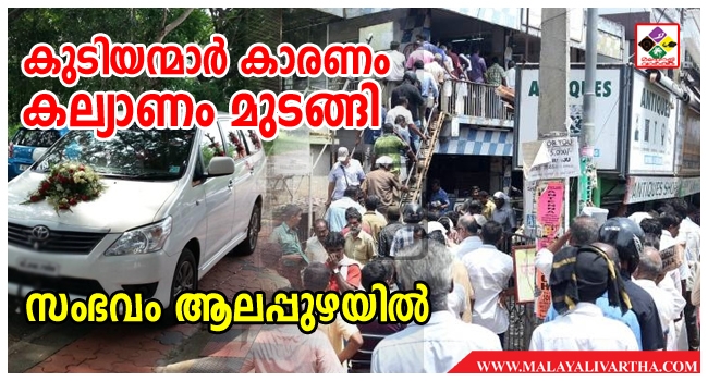 മുഹമ്മ കഞ്ഞിക്കുഴി റോഡില് കണ്ണാടിക്കവലയില് പ്രവര്ത്തിക്കുന്ന ബിവറേജസ് ഔട്ട്ലെറ്റിനു മുന്നിലെ തിരക്കാണ് വിവാഹം മുടങ്ങലിന്റെ വക്കോളമെത്തിച്ചത്. മൂന്നര കിലോമീറ്ററോളം നീണ്ട ക്യൂവും ഇതുമൂലമുണ്ടായ തിരക്കും നിയന്ത്രിക്കാന് പോലീസിന് ലാത്തി വീശേണ്ടിവന്നു.