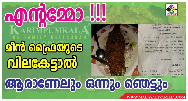 ഒരു മീന്വറുത്തതിന്റെ വില ആയിരം രൂപ. ഫൈവ് സ്റ്റാര് ഹോട്ടലില് ഒന്നുമല്ല കോട്ടയത്തെ ഒരു ഹോട്ടലില് ആണ് ഈ കഴുത്തറപ്പന് വില. നാട്ടകം കരിമ്പിന്കാല ഹോട്ടലില് നിന്നും ഭക്ഷണം കഴിച്ച നിഖില് രാജ് എന്ന യുവാവിനും കുടുംബത്തിനുമാണ് ഈ ദുരനുഭവം.