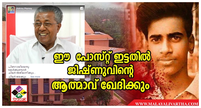 പിണറായിയെക്കുറിച്ച് ജിഷ്ണു പ്രണോയിയുടെ ഫേസ്ബുക്ക് പോസ്റ്റ്