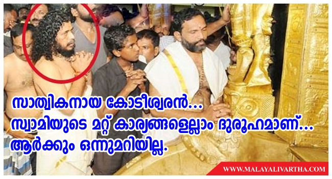 കൊല്ലത്തുകാരന് സുനില് സ്വാമിയുടെ യഥാര്ത്ഥ വീട് പാലക്കാട് ചെര്പ്പുളശേരിയിലാണ്. കശുവണ്ടി ബിസിനസ്സാണ് മേഖല. അങ്ങനെയാണ് കൊല്ലത്ത് എത്തി അവിടെ സ്ഥിര താമസമാക്കുന്നത്. അവിവാഹിതനുമാണ്. അയ്യപ്പനോടുള്ള കഠിനമായ ഭക്തികാരണം ശബരി എന്നാണ് സ്ഥാപനങ്ങളുടെ പേര്. സ്വാമിയുടെ മറ്റ് കാര്യങ്ങളെല്ലാം ദുരൂഹമാണ്. ആര്ക്കും ഒന്നുമറിയില്ല. കശുവണ്ടി കച്ചവടക്കാരന് എങ്ങനെ ശബരിമല വികസനത്തിന് കോടികള് ചെലവിടാനാകുന്നു എന്ന ചോദ്യത്തിനും ആര്ക്കും വ്യക്തമായ മറുപടി ഇല്ല.