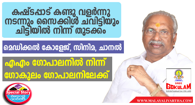 ചിട്ടി, മെഡിക്കല് കോളേജ്, സിനിമ, ചാനല്... അങ്ങനെ സര്വ മേഖലകളിലും വ്യാപിച്ചു കിടക്കുന്നയാളാണ് ഗോകുലം ഗോപാലന്. മലയാളിക്ക് എന്നും അഭിമാനിക്കാവുന്ന ലാളിത്യത്തിന്റെ ഉടമ. ഒന്നുമില്ലായ്മയില് നിന്നും വന്ന് വമ്പന് ബിസിനസ് സാമ്പ്രാജ്യം സൃഷ്ടിച്ച മഹത് വ്യക്തി കൂടിയാണ് ഗോകുകലം ഗോപാലന്.