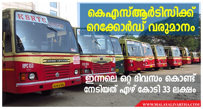 കെഎസ്ആര്ടിസിക്ക് ആശ്വസമേകി റിക്കോര്ഡ് വരുമാനം; ഇന്നലെ നേടിയത് ഏഴ് കോടി 33 ലക്ഷം