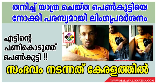 തനിക്കെതിരായ സീറ്റില് ഇരുന്ന യുവാവ് അസ്വാഭാവികമായി പെരുമാറുന്നത് ശ്രദ്ധിച്ച യുവതി മൊബൈല് ഫോണില് ക്യാമറ ഓണാക്കുകയായിരുന്നു. താന് ഒറ്റയ്ക്കാണ് എന്ന് മനസിലാക്കി പരസ്യമായി സ്വയം ഭോഗം ചെയ്തു കാണിച്ച യുവാവിന്റെ വീഡിയോ അയാളറിയാതെ റെക്കോര്ഡ് ചെയ്തു പെണ്കുട്ടി വാട്സാപ്പില് കൂടി പുറത്തുവിട്ടു.