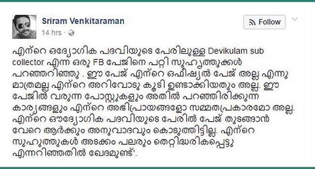 ഇതു തന്റെ ഔദ്യോഗിക ഫെയ്സ്ബുക് പേജല്ലെന്നും പോസ്റ്റുകള്ക്കു താന് ഉത്തരവാദിയല്ലെന്നുമുള്ള വിശദീകരണവുമായി സബ് കലക്ടര് സ്വന്തം പ്രൊഫൈലില് പോസ്റ്റ് ഇട്ടു.