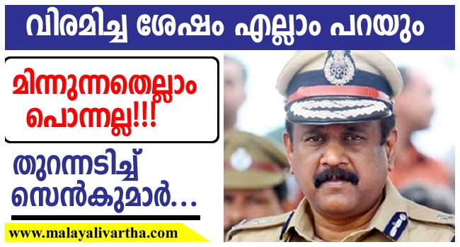 മിന്നുന്നതെല്ലാം പൊന്നല്ലെന്നും അത് ഉരച്ചു നോക്കിയാലേ മനസ്സിലാകുകയുള്ളൂവെന്നും ഋഷിരാജ് സിംങ്ങ്, സുരേഷ് കുമാര്, രാജു നാരായണസ്വാമി എന്നിവരുടെ മൂന്നാര് ഓപ്പറേഷനെ പരാമര്ശിച്ച് സെന്കുമാര് പരിഹസിച്ചു. കൊട്ടിഘോഷിക്കുന്ന ധീരകൃത്യങ്ങള്ക്ക് പിന്നീട് എന്താണ് സംഭവിച്ചതെന്ന് നോക്കണം. ഇവരെല്ലാം എത്ര ഉത്തരവുകളിലാണ് ഒപ്പിട്ടതെന്ന് പരിശോധിച്ചാല് തന്നെ കാര്യങ്ങള് വ്യക്തമാകുമെന്നും സെന്കുമാര് തുറന്നടിച്ചു.