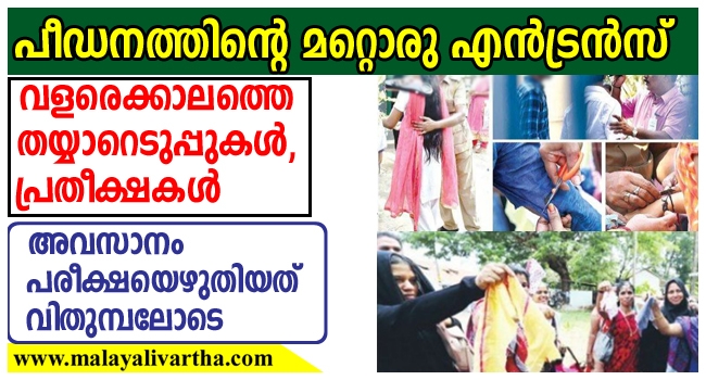 ഞായറാഴ്ച നടന്ന നീറ്റ് പരീക്ഷ വിദ്യാര്ത്ഥികളുടെ ആത്മവിശ്വാസം തകര്ത്തുകളഞ്ഞ പീഡനത്തിന്റെ മറ്റൊരു എന്ട്രന്സ്. മിക്ക പരീക്ഷ കേന്ദ്രങ്ങളിലും കണ്ണിരോടെയാണ് വിദ്യാര്ഥിനികള് ഹാളിലേക്ക് കയറിയത്. ആദ്യഘട്ട നാഷണല് എജിബിലിറ്റി എന്ട്രന്സ് പ്രവേശനപ്പരീക്ഷക്കെത്തിയ വിദ്യാര്ത്ഥിനികളുടെ അടിവസ്ത്രമഴിച്ചുള്ള പരിശോധനയില് വിദ്യാര്ഥിനികള് മാനസികമായി തകര്ന്നിരുന്നു. വളരെ കാലത്തെ കഠിനമായ പരിശ്രമങ്ങളെല്ലാം ഒറ്റനിമിഷം കൊണ്ടാണ് തകര്ന്നു പോയത്.