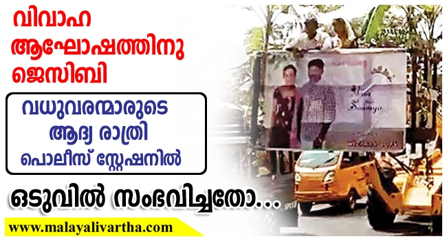 ജെസിബിയുടെ കയ്ക്കുള്ളില് സുഹൃത്തുക്കള് വരനെയും വധുവിനെയും കയറ്റിയിരുത്തിയ ശേഷം ബൈക്കുകളുടെയും കാറുകളുടെയും അകമ്പടിയോടെ വാഹനം ദേശീയ പാതയിലൂടെ വരന്റെ വീട്ടിലേയ്ക്കു കൊണ്ടു വരികയായിരുന്നു. ഇതോടെയാണ് മൂന്നു കിലോമീറ്ററിലധികം ദൂരം ദേശീയ പാതയില് ഗതാഗത തടസമുണ്ടാകുകയും ചെയ്തു. സംഭവമറിഞ്ഞു സ്ഥലത്തെത്തിയ പുന്നപ്രപൊലീസ് ഘോഷയാത്ര തടയുകയായിരുന്നു.