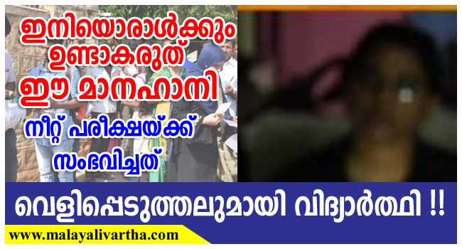 കണ്ണൂര് കുഞ്ഞിമംഗലം കൊവ്വപ്പുറം ടിഐഎസ്കെ ഇംഗ്ലീഷ് മീഡിയം സ്കൂളിലെ സെന്ററില് പരീക്ഷയ്ക്കു പോകുമ്പോള് അമ്മയും സഹോദരനും എനിക്കൊപ്പമുണ്ടായിരുന്നു. ഹാളിനു പുറത്തെ താല്ക്കാലിക ടെന്റിലായിരുന്നു ദേഹപരിശോധന. നാലു സ്ത്രീകളായിരുന്നു പരിശോധകര്. ചുരിക്കാറിനൊപ്പമുള്ള കറുത്ത പാന്റ്സ് ധരിച്ചു ഹാളില് കയറാന് കഴിയില്ലെന്നു പറഞ്ഞതോടെ മറ്റൊരു പാന്റ്സ് വാങ്ങാന് ഞങ്ങള് തുണിക്കട അന്വേഷിച്ചിറങ്ങി. ഞായര് അവധിയായതിനാല് രണ്ടര കിലോമീറ്റര് ദൂരം ഓട്ടോറിക്ഷയില് പോയാണു പുതിയ പാന്റ്സ് വാങ്ങി ധരിച്ചത്.