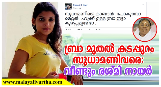 ഒറ്റ പോസ്റ്റ് കൊണ്ട് രശ്മി നായര് അവസാനിപ്പിച്ചിട്ടില്ല. സുധാമണിയെ കാണാന് പോകുമ്പോള് മെറ്റല് ഹുക്ക് ഉള്ള ബ്രാ ഇട്ടാല് കുഴപ്പമുണ്ടോ എന്നാണ് അടുത്ത ചോദ്യം!