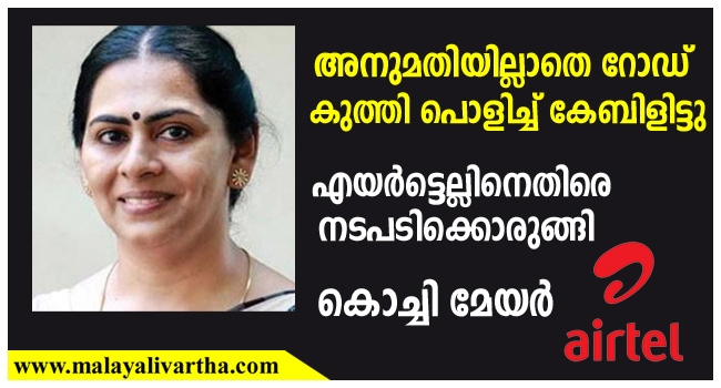 നഗരസഭയുടെ അനുമതിയില്ലാതെ റോഡ് കുത്തി പൊളിച്ച് കേബിളിലിട്ട എയര്ടെല്ലിനെതിരെ നടപടിയുമായി കൊച്ചി മേയര് സൗമിനി ജെയ്ന്. കൊച്ചി നഗരസഭയില് അനുമതിയില്ലാതെ റോഡ് പൊളിച്ച് കേബിള് ഇട്ടതില് വന് അഴിമതി നടന്നിട്ടുണ്ടെന്നാണ് പ്രതിപക്ഷ ആരോപണം. ആരോപണം ഉയരുന്നതിനു പിന്നാലെയാണ് ഇക്കാര്യത്തില് വിശദമായ അന്വേഷണം നടത്തി റിപ്പോര്ട്ട് സമര്പ്പിക്കണമെന്ന് നഗരസഭാ സെക്രട്ടറിക്ക് മേയര് നിര്ദ്ദേശം നല്കിയത് .