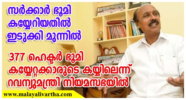 സംസ്ഥാനത്തു ഏറ്റവുമധികം ഭൂമി കൈയേറ്റം നടന്നിട്ടുളളത് ഇടുക്കി ജില്ലയിലാണെന്നും 377 ഹെക്ടര് ഭൂമി കൈയേറ്റക്കാരുടെ പക്കലാണെന്നും റവന്യുമന്ത്രി നിയമസഭയില് പറഞ്ഞു. ഇടുക്കി ജില്ലയില് മാത്രം 110 ഹെക്ടര് ഭൂമിയാണ് കൈയേറ്റക്കാര് കൈവശമാക്കിയിരിക്കുന്നത്. ഇതില് സ്പിരിറ്റ് ഇന് ജീസസ് മേധാവി സഖറിയാസ് വെളളിക്കുന്നില്, സിറില് പി ജേക്കബ് എന്നിവരാണ് ഇടുക്കിയില് സര്ക്കാരിന്റെ ഭൂമി ഏറ്റവുമധികം കൈയേറിയിട്ടുളളത്. ഇടുക്കിയിലെ കെഡിഎച്ച് വില്ലേജിലാണ് ഏറ്റവുമധികം കൈയേറ്റം നടന്നിട്ടുളളതെന്നും മന്ത്രി വ്യക്തമാക്കി.