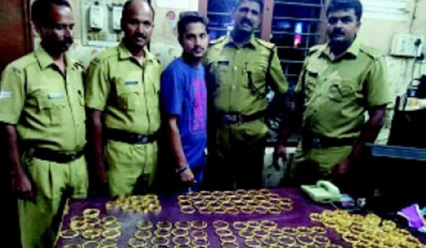 80 ലക്ഷത്തോളം രൂപ വിലവരും. 213 വള, 17 പാദസരം എന്നിവയാണ് കടത്താന് ശ്രമിച്ചത്. സ്വര്ണാഭരണം കൊണ്ടുവന്ന മഹാരാഷ്ട്ര സ്വദേശി യാഷ് മേത്തയെ (21) കസ്റ്റഡിയിലെടുത്ത് നികുതി വകുപ്പ് 13 ലക്ഷം രൂപ നികുതി ചുമത്തി.