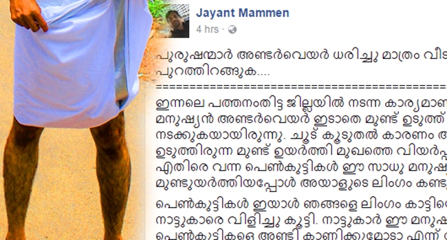 മുണ്ടുയര്ത്തി മുഖത്തെ വിയര്പ്പുതുടച്ചതോടെയാണ് പെണ്കുട്ടികള് ഇയാള് അപമാനിക്കാന് നഗ്നതാപ്രദര്ശനം നടത്തിയെന്ന് തെറ്റിദ്ധരിച്ചതെന്നാണ് സൂചന. സോഷ്യല് മീഡിയയില് പല വിഷയങ്ങളിലും പ്രതികരിക്കാറുള്ള ജയന്ത് മാമ്മന് ഇക്കാര്യം ഫേസ്ബുക്ക് പോസ്റ്റിലൂടെയും ചര്ച്ചാവിഷയം ആക്കിയിരിക്കുകയാണ് ഇപ്പോള്. എന്റെ പുരുഷ സുഹൃത്തുക്കള് കഴിവതും അണ്ടര്വെയര് ധരിക്കുക. നിങ്ങളുടെ ആരോഗ്യത്തിന് അത് നല്ലതാണ്... എന്ന് വ്യക്തമാക്കി ജയന്ത് മാമ്മന് നല്കിയ പോസ്റ്റും ഇതോടെ ചര്ച്ചയായി മാറി.