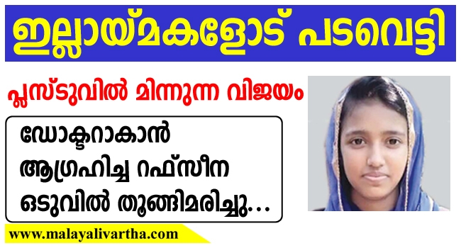 ലക്ഷംവീട് കോളനിയിലെ ഒറ്റമുറി വീട്ടില് ഇല്ലായ്മകള്ക്കിടയിലും മികച്ച രീതിയില് പ്ലസ് ടു ജയിച്ച പെണ്കുട്ടി ആത്മഹത്യ ചെയ്തു. മാലൂര് നിട്ടാറമ്പ് ലക്ഷംവീട് കോളനിയിലെ നാമത്ത് റഫ്സീന(17)യാണ് മരിച്ചത്. ശിവപുരം ഹയര് സെക്കന്ഡറി സ്കൂള് വിദ്യാര്ഥിനിയായ റഫ്സീന ബയോളജി ഗ്രൂപ്പില് 1200ല് 1180 മാര്ക്ക് നേടിയിരുന്നു.