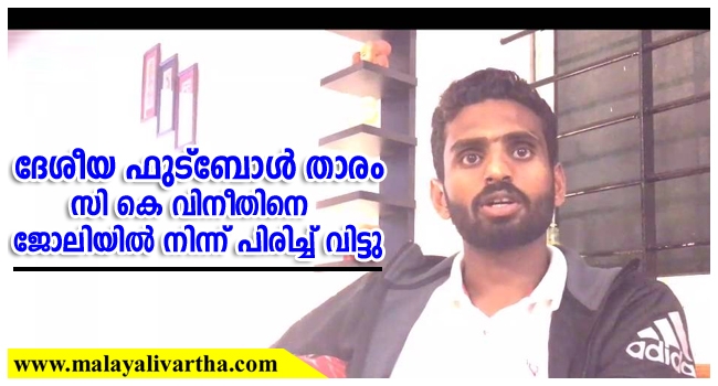 ദേശീയ ഫുട്ബോള് താരം സി കെ വിനീതിനെ ജോലിയില് നിന്ന് പിരിച്ച് വിട്ടു. ജോലിയില് നിന്നും ഒഴുവാക്കരുതെന്ന കായിക മന്ത്രി ആവശ്യപ്പെട്ടിട്ടും എജീസ് ഓഫീസിലെ ഓഡിറ്റര് തസ്തികയില് നിന്നും വിനീതിനെ ഒഴിവാക്കുകയായിരുന്നു. മതിയായ ഹാജര് ഇല്ലെന്ന് ചൂണ്ടിക്കാട്ടിയാണ് നടപടി. സ്പോര്ട്സ് ക്വോട്ടയിലാണ് വിനീത് ജോലിയില് പ്രവേശിച്ചിരുന്നത്.
