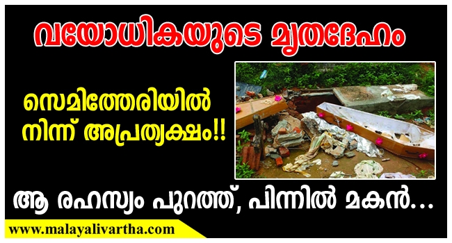 പള്ളി സെമിത്തേരിയില് അടക്കംചെയ്ത വയോധികയുടെ മൃതദേഹം അപ്രത്യക്ഷമായി. സംഭവുമായി ബന്ധപ്പെട്ടു നടത്തിയ അന്വേഷണത്തില് ഞെട്ടിക്കുന്ന വിവരങ്ങളാണ് പുറത്തുവന്നത്. മകനെ പോലീസ് അറസ്റ്റ് ചെയ്തിട്ടുണ്ട്. 54 ദിവസങ്ങള്ക്കു മുമ്പാണ് നടുത്തേരി ബേക്കച്ചാല് മുകളുവിള വീട്ടില് കുഞ്ഞേലി കുഞ്ഞപ്പിയുടെ (88) മൃതദേഹം തലവൂര് ഓര്ത്തഡോക്സ് വലിയ പള്ളി സെമിത്തേരിയില് സംസ്കരിച്ചത്.