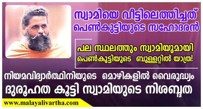 ഈ സമയം നിയന്ത്രണം വിട്ട താന് സ്വാമിയുടെ കൈയിലെ കത്തി തട്ടിയെടുത്ത് ലിംഗം അറുത്തു മാറ്റുകയായിരുന്നുവെന്നും യുവതി പരാതിയില് പറയുന്നു. തന്നെ പതിനേഴാം വയസുമുതല് സ്വാമി പീഡനത്തിനിരയാക്കുകയായിരുന്നുവെന്നാണ് പെണ്കുട്ടി പറയുന്നത്. പെണ്കുട്ടിക്കൊപ്പം താന് പല സ്ഥലത്തും ബുള്ളറ്റില് യാത്ര ചെയ്തിട്ടുണ്ടെന്ന് സ്വാമിയും പറയുന്നു. കോലഞ്ചേരിയിലെ സ്വാമിയുടെ ബന്ധുക്കളും ഇത് സാധൂകരിക്കുന്നുണ്ട്. മുന്പ് ഒന്നുരണ്ടു തവണ സ്വാമി നാട്ടിലെത്തിയപ്പോല് ഈ യുവതിയും ബുള്ളറ്റിലുണ്ടായിരുന്നു.