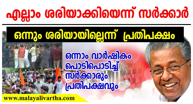 അതേസമയം, വാര്ഷികാഘോഷത്തിനിടെ വന്പ്രക്ഷോഭപരിപാടികള്ക്കാണ് പ്രതിപക്ഷ കക്ഷികള് തയ്യാറെടുക്കുന്നത്. യു.ഡി.എഫ് എല്ലാ ജില്ലയിലും പ്രതിഷേധ പരിപാടികള് നടത്തുമ്പോള് യൂത്ത് കോണ്ഗ്രസും യുവമോര്ച്ചയും ഭരണസിരാകേന്ദ്രമായ സെക്രട്ടേറിയറ്റ് ഉപരോധിക്കും. കാര്യമായ നേട്ടമൊന്നും ഒരു വര്ഷംകൊണ്ട് സൃഷ്ടിക്കാനായില്ലെന്ന ആരോപണമാണ് പ്രതിപക്ഷത്തിന്. ഒന്നും ശരിയാകാത്ത ഒരു വര്ഷമായി അവര് ചിത്രീകരിക്കുന്നു. പ്രതിപക്ഷ നേതാവ് രമേശ് ചെന്നിത്തല സര്ക്കാറിനെതിരെ 65 ഇന കുറ്റപത്രം ചുമത്തും.