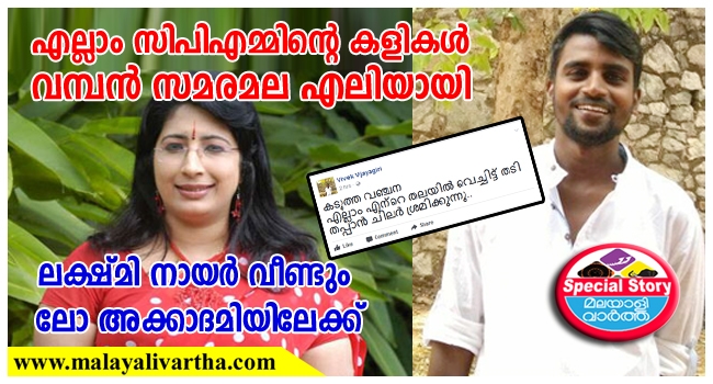 ലക്ഷ്മീ നായര് ലോ അക്കാദമി പ്രിന്സിപ്പല് സ്ഥാനത്തേക്ക് എത്തും. സമരം പൊടിപൊടിച്ചതുമാത്രം മിച്ചം. റാണിയായി ജയിച്ചതിന്റെ സന്തോഷം അടക്കാനാകാതെ ലക്ഷ്മീ നായര് ഇഞ്ചി കടിച്ച അണ്ണാന്മാരെപ്പോലെ സമരക്കാരും. ലോ അക്കാദമിയിലെ സമരത്തെ തുടര്ന്ന് പ്രിന്സിപ്പലായിരുന്ന ലക്ഷ്മി നായര്ക്കെതിരെ ഉയര്ന്ന ജാതി അധിക്ഷേപ പരാതി പിന്വലിപ്പിച്ചതിന് പിന്നില് സിപിഐ സംസ്ഥാന നേതൃത്വം. അക്കാദമിയിലെ വിദ്യാര്ത്ഥികളും സമരത്തിന്റെ മുന്നിരയിലുണ്ടായിരുന്ന എഐഎസ്എഫുകാരുമായ വിവേക് വിജയഗിരി,ശെല്വം എന്നിവര് ഹൈക്കോടതിയില് നല്കിയ ഹര്ജിയിലാണ് സിപിഐയുടെ ഇടപെടലുണ്ടായിരിക്കുന്നത്. സിപിഐയുടെ സംസ്ഥാന അസിസ്റ്റന്റ് സെക്രട്ടറിമാരില് ഒരാളാണ് പാര്ട്ടി നിര്ദേശ പ്രകാരം കേസ് പിന്വലിപ്പിക്കുന്നതിനുളള നിര്ദേശങ്ങള് നേരിട്ട് നല്കിയതും.