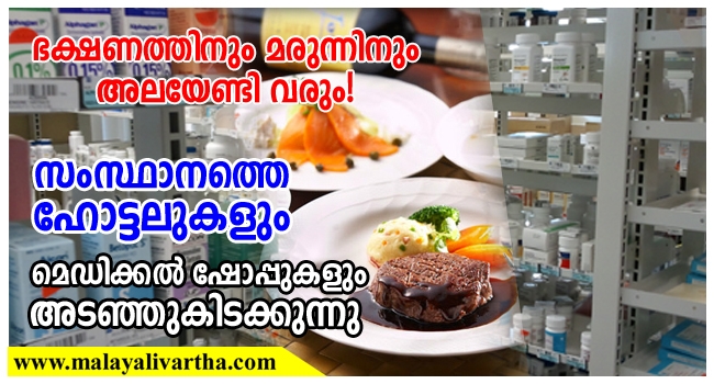 ജിഎസ്ടിയിലെ അപാകതകളില് പ്രതിഷേധിച്ച് സംസ്ഥാനത്തെ ഹോട്ടലുടമകളും, ഓണ്ലൈന് മരുന്ന് വ്യാപാരം ആരംഭിക്കുന്നതില് പ്രതിഷേധിച്ച് മെഡിക്കല് ഷോപ്പുടമകളും കടകള് അടച്ചിട്ട് പ്രതിഷേധിക്കുന്നു. മെയ് 30 ചൊവ്വാഴ്ച സംസ്ഥാനത്തെ ഹോട്ടലുകളും മെഡിക്കള് ഷോപ്പുകളും തുറക്കില്ല.