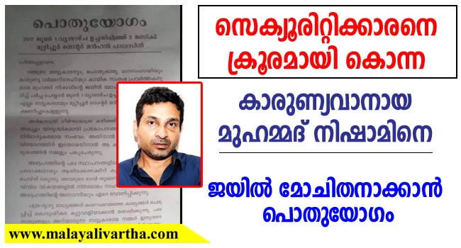 സെക്യൂരിറ്റി ജീവനക്കാരനായിരുന്ന ചന്ദ്രബോസിനെ ക്രൂരമായി കൊന്ന മുഹമ്മദ് നിഷാമിന് വേണ്ടി നാട്ടുകാരുടെ പേരില് പൊതുയോഗം