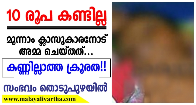 മൂന്നാം ക്ലാസുകാരനെ അമ്മ പൊള്ളലേല്പ്പിച്ചു. തൊടുപുഴ പെരുമ്പിള്ളിച്ചിറയിലാണ് സംഭവം നടന്നത്. പഫ്സ് വാങ്ങാന് 10 രൂപ മോഷ്ടിച്ചെന്ന് ആരോപിച്ചാണ് അമ്മ മകനോട് കടുംകൈ ചെയ്തത്. ഒമ്പത് വയസ്സുകാരനായ മകന്റെ വയറ്റിലും മുഖത്തും കൈയിലും പൊള്ളലേറ്റിട്ടുണ്ട്.