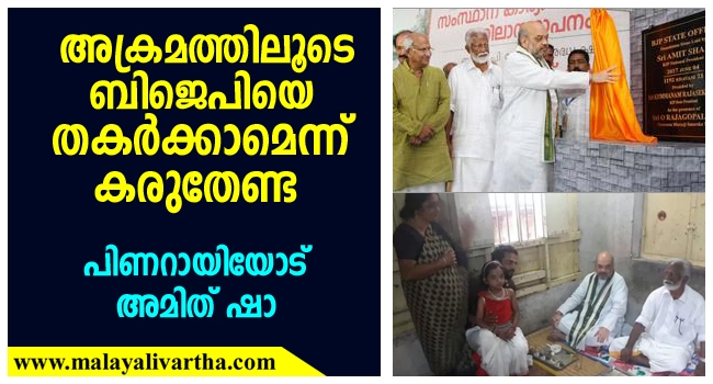 ഇടതുമുന്നണി ബി.ജെ.പിക്കാരെ തിരഞ്ഞ് പിടിച്ച് ആക്രമിക്കുകയാണ്. മുഖ്യമന്ത്രി പിണറായി വിജയന്റെ സ്വന്തം നാടായ കണ്ണൂരിലാണ് ബി.ജെ.പിക്കാര് കൂടുതല് ആക്രമണം നേരിടുന്നത്. എന്നാല്, അക്രമം കൊണ്ട് ബി.ജെ.പിയുടെ വളര്ച്ചയെ അടിച്ചമര്ത്താനാവില്ലെന്നും ഷാ പറഞ്ഞു. ജനസംഘത്തിന്റെ പത്ത് എം.പിമാരുമായി പ്രവര്ത്തനം ആരംഭിച്ച ബി.ജെ.പി ഇന്ന് വലിയ പാര്ട്ടിയായി മാറി. പതിനൊന്ന് കോടി അംഗങ്ങളാണ് ബി.ജെ.പിക്കുള്ളത്. കേരളത്തില് ബി.ജെ.പിക്ക് പ്രവര്ത്തനം നടത്തുക എന്നത് കഠിനമായ കാര്യമാണ്.