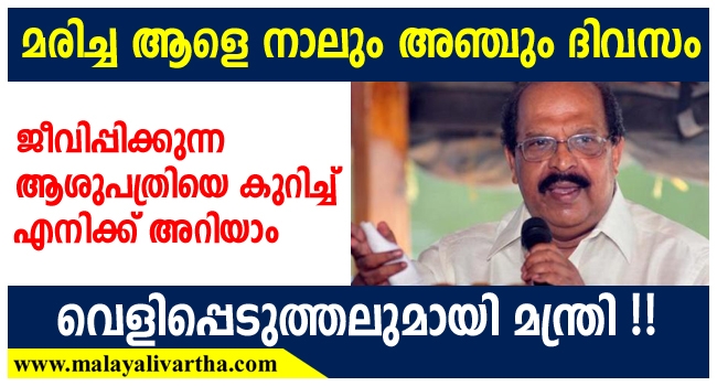 ആളുകള് മരിച്ചാലും നാലും അഞ്ചും ദിവസം വെന്റിലേറ്ററില് വെച്ച് കൃത്രിമശ്വാസം നല്കി പണം തട്ടുന്ന എറണാകുളത്തെ വന്കിട ആശുപത്രികളെ തനിക്കറിയാമെന്ന് പൊതുമരാമത്ത് വകുപ്പ് മന്ത്രി ജി സുധാകരന്. ഇങ്ങനെ ചെയ്യുന്ന നിരവധി കേസുകള് റിപ്പോര്ട്ട് ചെയ്തിട്ടുണ്ടെന്നും സുധാകരന് ആലപ്പുഴയില് പറഞ്ഞു. ആലപ്പുഴ പ്രസ്സ് ക്ലബ്ബ് സംഘടിപ്പിച്ച ആരോഗ്യ ക്യാമ്പ് ഉദ്ഘാടന ചടങ്ങിലാണ് സുധാരന്റെ വെളിപ്പെടുത്തല്.