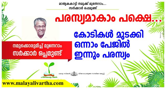 പരിസ്ഥിതി ദിനമായ തിങ്കളാഴ്ചയും കോടികള് ചെലവഴിച്ചാണ് പരസ്യം നല്കിയിരിക്കുന്നത്. ഒട്ടുമിക്ക പത്രങ്ങളിലും ഒന്നാം പേജില് മുഴുവന് പേജ് പരസ്യമുണ്ട്. 25 കോടിയെങ്കിലും മുടക്കാതെ ഇത്തരത്തില് പരസ്യം നല്കാനാവില്ല. പരിസ്ഥിതി ദിനത്തിന്റെ പരസ്യം ദൃശ്യമാധ്യമങ്ങളില് വരാന് തുടങ്ങിയിട്ട് ആഴ്ചകളായി.