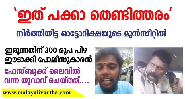 നിര്ത്തിയിട്ട ഓട്ടോറിക്ഷയുടെ ഫ്രണ്ട്സീറ്റിലിരുന്നാല് 300 രൂപാ പിഴയോ...? എന്താണു സാര് ഈ 183ാം വകുപ്പ്? പിഴ ഈടാക്കിയ പോലീസിനെതിരെ ഫേസ്ബുക്ക് ലൈവിലൂടെ പ്രതിഷേധിച്ച് യുവാവ്