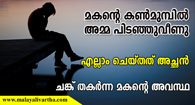 രാവിലെ പണിക്ക് പോയശേഷം ഉച്ചയോടെ മദ്യപിച്ച് ലക്ക്കെട്ട് വീട്ടിലെത്തി. പിന്നെ കൈയില് കരിതിയിരുന്ന മദ്യക്കുപ്പി കാണാനില്ലന്നും പറഞ്ഞ് ഒച്ചപ്പാടായി. ഒളിപ്പിച്ചുവച്ച മദ്യക്കുപ്പി എടുത്തുകൊണ്ടുവരാന് ആവശ്യപ്പെട്ട് ആദ്യം തല്ലി. പിന്നെ വയറിന് ചവിട്ടി. അവശയായതിനെത്തുടര്ന്ന് രാത്രി ആശുപത്രിയിലേക്ക് കൊണ്ടുപോകും വഴി മരണമടഞ്ഞുവെന്നാണ് മകന് പറയുന്നത്.
