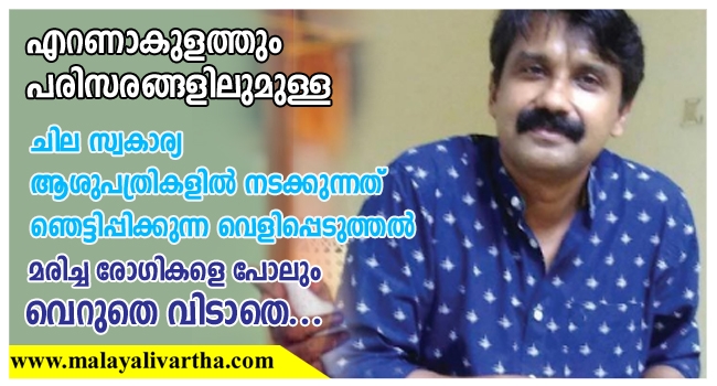 മരിച്ചരോഗികളെ ചികിത്സിച്ച് സ്വകാര്യ ആശുപത്രികള് ജനങ്ങളെ കൊള്ളയടിക്കുന്നതായി ഫോറന്സിക് സര്ജന്. എറണാകുളം ഗവ. മെഡിക്കല് കോളേജിലെ അസോസിയേറ്റ് ഫോറന്സിക് സര്ജനും പോലീസ് സര്ജനുമായ ഡോ. ഹിതേഷ് ശങ്കറിന്റേതാണ് വെളിപ്പെടുത്തല്. എറണാകുളത്തും പരിസരങ്ങളിലുമുള്ള ചില സ്വകാര്യ ആശുപത്രികളാണ് ഇത്തരം ചികിത്സ നടത്തുന്നത്. മരണശേഷമാണ് ആശുപത്രിയിലെത്തിച്ചതെന്ന് റിപ്പോര്ട്ട് ചെയ്യുന്ന ആശുപത്രിക്കാര് തന്നെ പോസ്റ്റ്മോര്ട്ടത്തിനെത്തിക്കുന്ന മൃതദേഹങ്ങളില് ചികിത്സ നടത്തിയതിന്റെ തെളിവുകള് ലഭിച്ചിട്ടുണ്ടെന്ന് അദ്ദേഹം പറഞ്ഞു. ഒരു പ്രമുഖ പത്രമാണ് ഇക്കാര്യം റിപ്പോര്ട്ട് ചെയ്യുന്നത്.