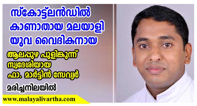 2013 ഡിസംബറില് പൗരോഹിത്യം സ്വീകരിച്ച ഫാ. മാര്ട്ടിന് സേവ്യര്, ചെത്തിപ്പുഴ പള്ളിയില് സഹവികാരിയായിരിക്കെയാണ് 2016 ജൂലായില് സ്കോട്ട് ലന്ഡിലേക്ക് പോയത്. അവിടെ പി.എച്ച്.ഡി പഠനത്തോടൊപ്പം, എഡിന്ബറോ രൂപതയുടെ കീഴിലുള്ള ക്രിസ്റ്റോര്ഫിന് ഇടവകയുടെ ചുമതലയും വഹിച്ചുവരികയായിരുന്നു. ചൊവ്വാഴ്ച വരെ നാട്ടിലെ ബന്ധുക്കളുമായി ഫോണില് ബന്ധം പുലര്ത്തിയിരുന്ന വൈദികനെപ്പറ്റി ബുധനാഴ്ച മുതലാണ് വിവരമൊന്നും ഇല്ലാതായത്.