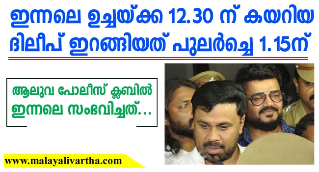 പുലര്ച്ചെ തേനിയിലെ ഷൂട്ടിംഗ് ലൊക്കേഷനില് നിന്ന് ദിലീപ് ആലുവയിലെ വീട്ടിലേക്ക്. 12 മണിക്ക് മുന്പ് ആലുവാ പോലീസ് ക്ലബിലേക്ക് എത്താനായിരുന്നു നിര്ദ്ദേശം. 12.10ന് KL 07 CH 5445 നമ്പറുള്ള പോളോ കാറില് പൊലീസ് ക്ലബിലേക്ക്. കാത്ത് നിന്ന മാധ്യമപ്രവര്ത്തരോട് മാധ്യമവിചാരണയ്ക്കില്ലെന്ന് കുറഞ്ഞ വാക്കില് പ്രതികരണം.
