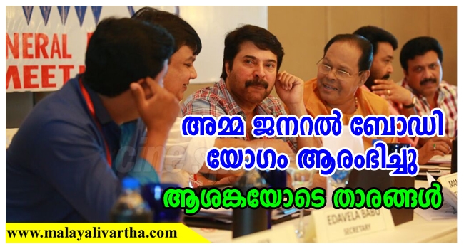മലയാള സിനിമ താരങ്ങളുടെ സംഘടനയായ അമ്മയുടെ ജനറല് ബോഡി യോഗം ഉടന് കൊച്ചിയില് ചേരും. നടി ആക്രമിക്കപ്പെട്ട സംഭവം അടക്കമുള്ളവ ഇന്നത്തെ യോഗത്തില് ഉന്നയിക്കുമെന്ന് ഇന്നലെ ഭാരവാഹികള് വ്യക്തമാക്കിയിരുന്നു. മൂന്നു മണിക്കു ശേഷം മാധ്യമങ്ങളെ കാണുമെന്നും അമ്മ പ്രസിഡന്റ് ഇന്നസെന്റ് വ്യക്തമാക്കി.
