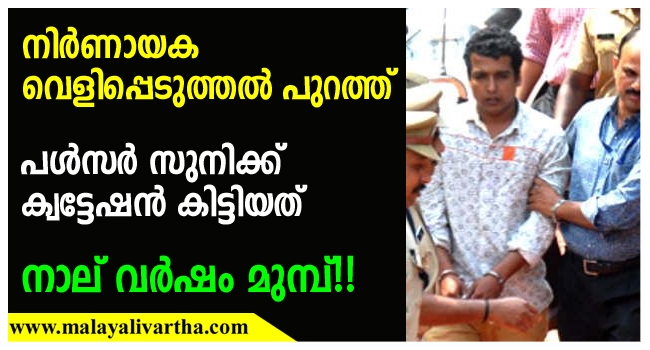 നടിയെ തട്ടിക്കൊണ്ടുപോയി ആക്രമിച്ച സംഭവത്തില് മുഖ്യപ്രതി പള്സര് സുനിക്ക് ക്വട്ടേഷന് കിട്ടിയതു നാലുവര്ഷം മുമ്പ്. നടിയെ കെണിയിലാക്കാന് സുനി മൂന്നുവട്ടം ശ്രമിച്ചിരുന്നതായി പോലീസിന് വിവരം ലഭിച്ചു. തൃശൂരില് വച്ച് ഒരു തവണ നടിയെ കെണിയിലാക്കാന് സുനി ശ്രമിച്ചതായും വിവരം ലഭിച്ചു. അന്നു പരാജയപ്പെട്ടതിനെത്തുടര്ന്ന് ക്വട്ടേഷന് നല്കിയയാള് സുനിയെ വിളിച്ചന്വേഷിച്ചു. നടിക്കു മലയാള സിനിമയില് കൂടുതല് അവസരങ്ങള് ലഭിക്കാത്തതിനാല് തട്ടിക്കൊണ്ടു പോകലിനു തടസം നേരിട്ടു.