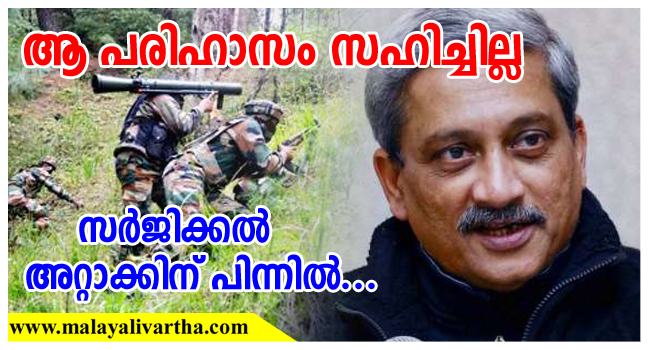 സൈന്യത്തിന് ഏറെ അഭിനന്ദനം നേടിക്കൊടുത്തതാണ് സര്ജിക്കല് അറ്റാക്ക്. എന്നാല് അതിന് പ്രേരിപ്പിച്ച ഘടകം തുറന്ന് പറയുകയാണ് മുന് പ്രതിരോധമന്ത്രിയും ഗോവ മുഖ്യമന്ത്രിയുമായ മനോഹര് പരീക്കര്. കേന്ദ്ര വാര്ത്താവിതരണ സഹമന്ത്രി രാജ്യവര്ധന് സിങ് റാത്തോഡിനോടുള്ള ടെലിവിഷന് അവതാരകന്റെ ചോദ്യമാണ് പാക്ക് അധീനകശ്മീരില് മിന്നലാക്രമണം നടത്താന് പ്രേരിപ്പിച്ചതെന്ന് മനോഹര് പരീക്കര് പറഞ്ഞു. പനജിയില് നടന്ന വ്യവസായികളുടെ യോഗത്തിലായിരുന്നു പരീക്കറിന്റെ പ്രസ്താവന.