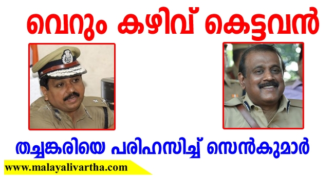 തച്ചങ്കരിക്കെതിരെ അതി രൂക്ഷ പരിഹാസവുമായി സെന്കുമാര്. പോലീസ് തലപ്പത്ത് ന്യൂറോ സര്ജന് വേണ്ടസമയത്ത് ഇപ്പോള് ഇറച്ചിവെട്ടുകാരനെയാണ് ഇരുത്തിയിരിക്കുന്നത്. ഇയാള് വെറും കഴിവ്കെട്ടവനാണ്. വിടവാങ്ങള് പ്രസംഗത്തിലും സെന്കുമാര് പറഞ്ഞത് സേനക്കുള്ളിലാണ് പുഴുക്കുത്തുകള് എന്നാണ്. പോലീസ് ആസ്ഥാനത്ത് അതിരൂക്ഷ വാക്ക്പോര് തച്ചങ്കരിയുമായി അദ്ദേഹം നടത്തിയിരുന്നു. കേസില് വിജയിച്ചെത്തിയ സെന്കുമാറിനെ ഒതുക്കാനായിരുന്നു തച്ചങ്കരിയെ പോലീസ് ആസ്ഥാനത്ത് ഗവണ്മെന്റ് നിയമിച്ചത്. അത് നയിച്ചതാകട്ടെ തലപ്പത്തെ തമ്മിലടിയിലേക്കും.
