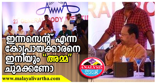മകള്ക്കു പിന്തുണ നല്കാന് കഴിയാത്ത അമ്മയെ നയിക്കുന്ന ഇന്നച്ചന് എന്ന കോപ്രായക്കാരന്റെ നേര്ക്കു കേരളം വിരല്ചൂണ്ടുന്നു. ഇരയെയും വേട്ടക്കാരനെയും തിരിച്ചറിയാന് കഴിയാത്ത കോമാളിവേഷം ഇനിയെന്തിന്? ഇരയ്ക്കു പിന്തുണയറിയിക്കാന് പ്രമേയമുണ്ടോ? എന്ന പത്രക്കാരുടെ ചോദ്യത്തിനു മുന്നില് ഗോഷ്ഠി കാട്ടി അമ്മയ്ക്കു ചുറ്റും കൂടിയ കെട്ടിലമ്മമാരുടെ മുതുകുകുലുക്കിയുള്ള ചിരിക്കു മുന്നില് ചിലരെയൊക്കെ തന്റെ ഭാവാഭിനയം കൊണ്ട് മലര്ത്തിയടിച്ചെന്ന ഭാവം . ഇന്നസെന്റ് ഇനി താങ്കള് അമ്മയുടെ പ്രസിഡന്റ് സ്ഥാനം രാജിവയ്ക്കുന്നതാണ് നല്ലത്.
