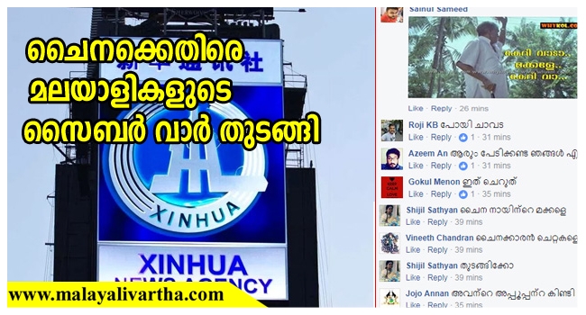 ചൈനക്കെതിരെ മലയാളികളുടെ യുദ്ധകാഹളം. ചൈനയുടെ ഔദ്യോഗിക വാര്ത്താ ഏജന്സിയായ ഷിന്ഹ്വ ന്യൂസ് ഏജന്സിയുടെ ഔദ്യോഗിക ഫേസ്ബുക്ക് പേജിന്റെ കമന്റ് ബോക്സുകളില് മലയാളികളുടെ വക വന് പൊങ്കാല ആഘോഷം. ഇന്ന് രാവിലെ മുതലാണ് ഷിന്ഹ്വയുടെ ഫേസ്ബുക്ക് പേജില് മലയാളികള് പൊങ്കാലയ്ക്കുള്ള അടുപ്പ് കൂട്ടിത്തുടങ്ങിയത്.