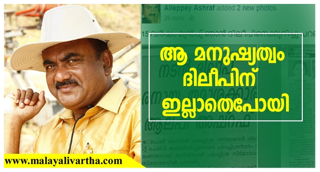 ദിലീപിനെ വെള്ളിത്തിരയില് കൊണ്ടുവന്ന് പ്രേക്ഷകരെ പരിചയപ്പെടുത്തിയ നിര്മാതാക്കളോട് നീതിക്ക് നിരക്കാത്ത നിലപാടാണ് സ്വീകരിച്ചത്. ഇത്തരം ക്രൂരതമാശകള് ദിലീപ് ആവര്ത്തിക്കില്ലെന്നു പ്രത്യാശിക്കുന്നു; ഇതായിരുന്നു അഷറിഫിന്റെതായ പ്രതികരണമായി വാര്ത്തയില് വന്നത്. ഈ വാര്ത്തയാണ് ആലപ്പി അഷറഫ് 15 വര്ഷങ്ങള്ക്കു മുമ്പ് ഞാന് ദിലീപിനെക്കുറിച്ച് പറഞ്ഞതെന്ന വാചകത്തോടെ ഷെയര് ചെയ്തിരിക്കുന്നത്.