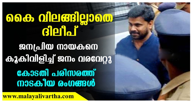 ദിലീപിനെ കാത്ത് കോടതി പരിസരത്ത് ആയിരക്കണക്കിനാളുകളാണ് തമ്പടിച്ച് നിന്നത്. പല സ്ഥലങ്ങളിലും നിന്ന് വണ്ടി പിടിച്ചാണ് ആളുകള് അതിരാവിലെ കോടതി പരിസരത്ത് എത്തിയത്. ദിലീപ് ചിത്രത്തിന്റെ റിലീസിന്റെ പ്രതീതിയായിരുന്നു ജനക്കൂട്ടത്തിനു. ദിലീപിനെ ഒരു നോക്ക് കാണാനായി ജനങ്ങള് മരത്തിന്റെ മുകളിലും വലിയ കെട്ടിടത്തിന്റെ മുകളില് കഴറിനിന്നു. സ്ത്രീകള് പോലും ഓഫീസില് കഴറാതെ താരത്തെ ഒരു നോക്ക് കാണാനായി കാത്ത് നിന്നു.