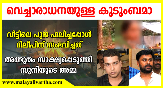 പള്സര് സുനിയുടെ മാതാവ് മാധ്യമങ്ങളോട് വ്യക്തമാക്കിയത് ഇങ്ങനെയാണ്. കഴിഞ്ഞ ഞായറാഴ്ച ഞാനും എന്റെ മകളും കുടി ദേശത്ത് പള്ളിപ്പാട്ട് കാവില് പ്രാര്ത്ഥിച്ചിട്ട് വന്നു. തിങ്കളാഴ്ചയാണ് വീട്ടില് സര്പ്പപൂജ തുടങ്ങി. എന്തായാലും പൂജക്ക് ശേഷം ഫലംകണ്ടു. ദിലീപ് അറസ്റ്റിലായി.