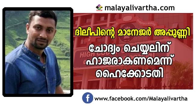 നടി ആക്രമിക്കപ്പെട്ട കേസിൽ ദിലീപിന്റെ മാനേജർ അപ്പുണ്ണി ചോദ്യം ചെയ്യലിന് ഹാജരാകണമെന്ന് ഹൈക്കോടതി ഉത്തരവിട്ടു. അപ്പുണ്ണി സമർപ്പിച്ച മുൻകൂർ ജാമ്യഹർജി പരിഗണിച്ചാണ് കോടതി ഉത്തരവ്. മുൻകൂർ ജാമ്യം നൽകുന്നത് അന്വേഷണത്തെ ബാധിക്കുമെന്നും കോടതി നിരീക്ഷിച്ചു.